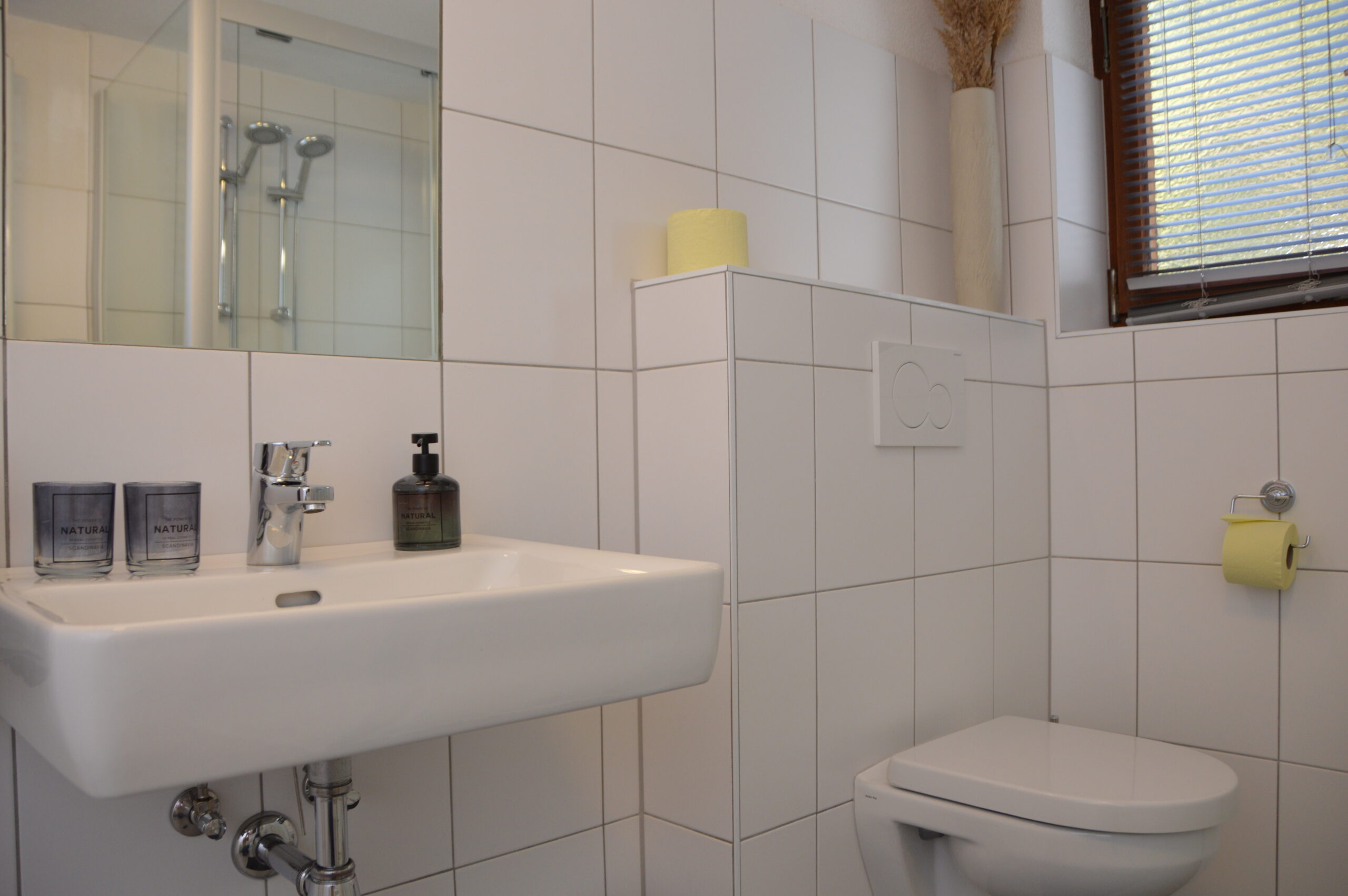 • OG: Doppelzimmer mit Waschbecken, Dusche und Zusatzliege